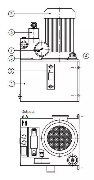 Основным элементом силового агрегата является стальной резервуар (1) оснащенный индикатором уровня масла (3) и наполнителем (4).