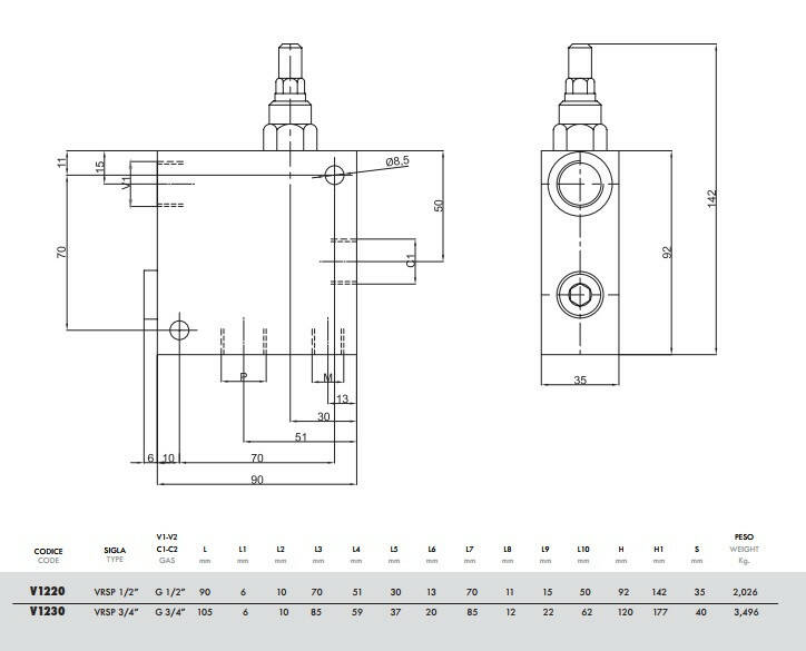 Код Внутренняя резьба P, V2, C2 (BSP) Внутренняя резьба M (BSP) Максимальный расход (л / мин) Максимум давление (бар)