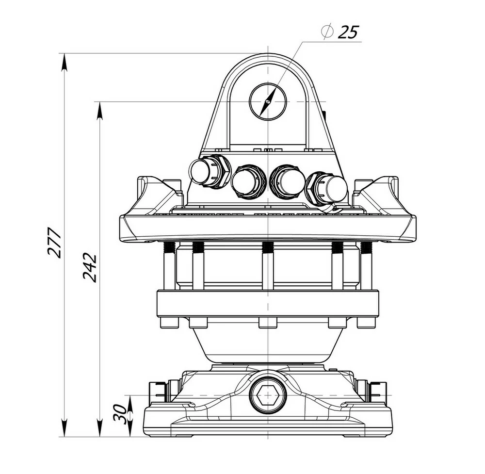 Верхняя часть ротатора выполнена в виде одиночной проушины для шарнирного соединения. Крепкая и надёжная конструкция, позволяющая выдерживать перегрузки. Ширина одиночной проушины является стандартной 60мм и диаметр оси (пальца) 25мм.