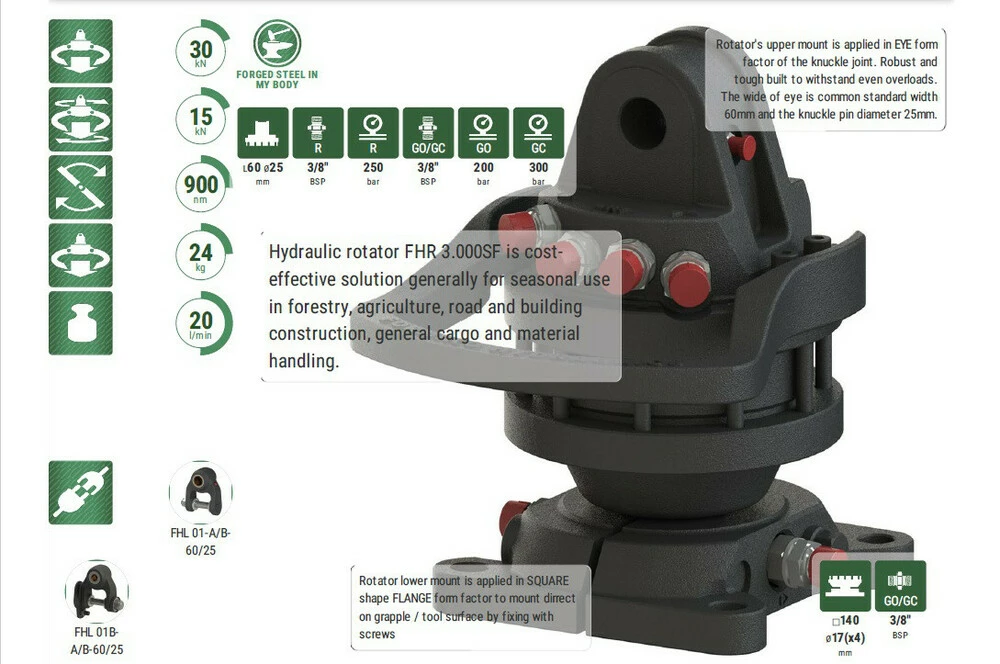 Гидравлический ротатор FHR 3.000SF является экономически выгодным решением обычно используется по сезону в лесозаготовке, в сельском хозяйстве, в грузоперевозках и перегрузке материалов и сырья.