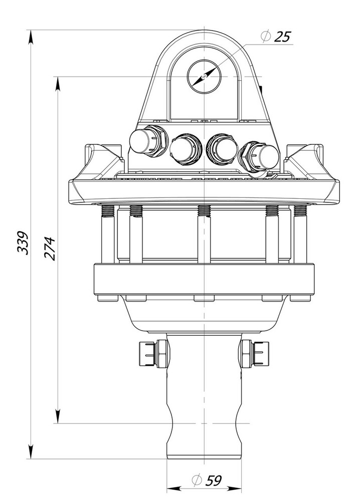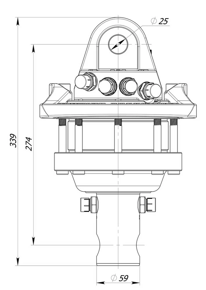 Нижняя часть ротатора исполнена в виде вала для соединения с грейфером через монтажный цилиндр (стакан) и фиксацией при помощи оси (пальца). Диаметр оси (пальца) равен 59мм и диаметр пальца (в комплект не входит) 30мм