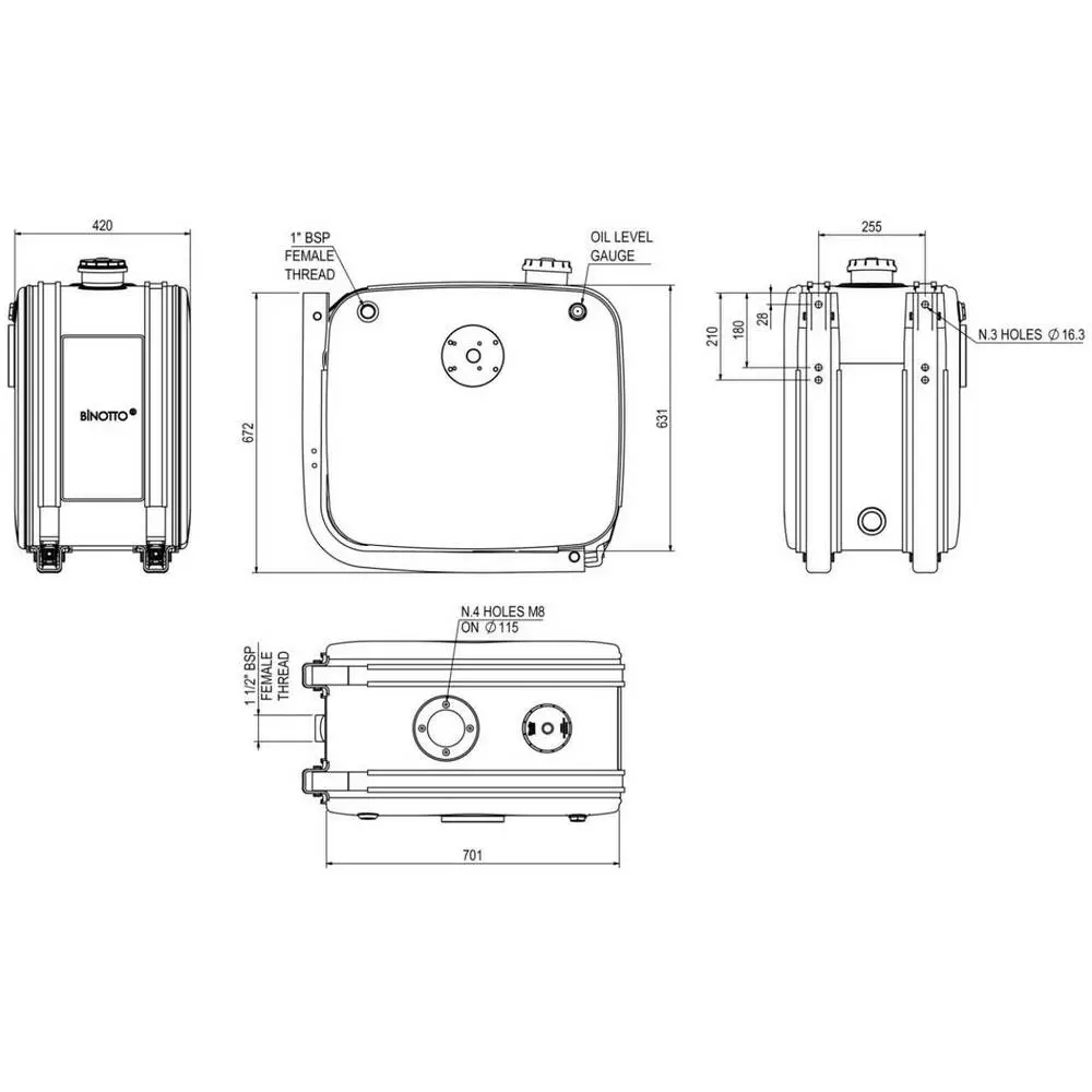 Благодаря широкому выбору вариантов объемом от 60 до 200 литров баки Binotto с боковым креплением подходят для удовлетворения всех требований на любом рынке, обеспечивая превосходную надежность и долговечность. Бак гидравличейский боковой на 150 л изготовлен из стали и рабочим объем 120 л.