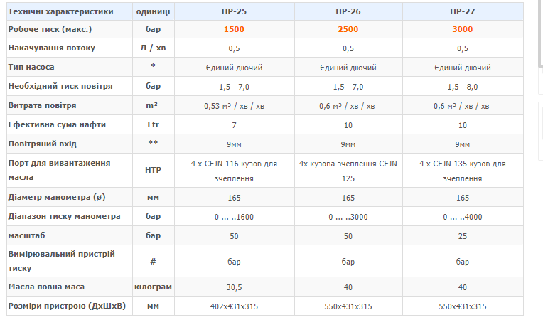Гидравлический насос серии HP с пневматическим приводом с давлением 7 бар обеспечивает гидравлическое давление 1500 бар, 2500 и 3000 бар в трех разных моделях. Устройство подает 0,5 л масла в минуту при максимальном давлении.