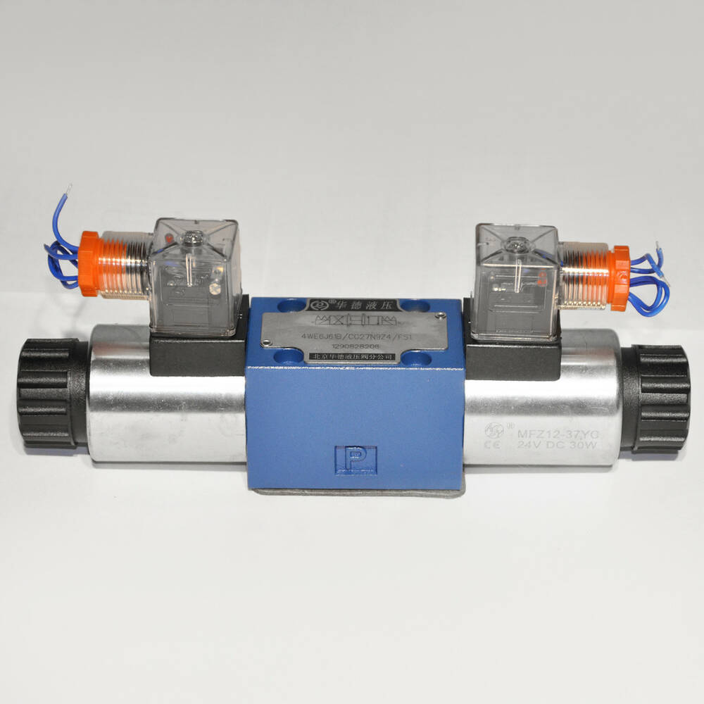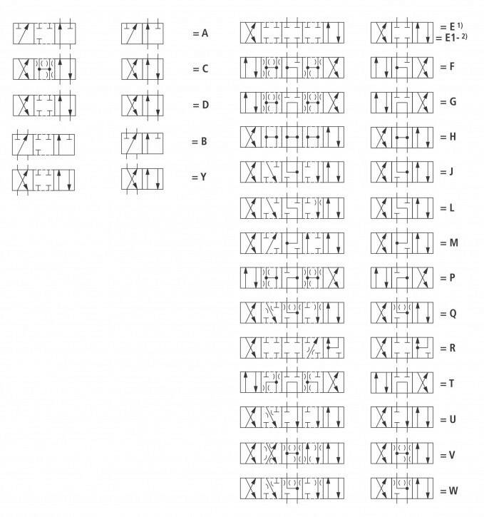 Гидрораспределители WE6 предназначены для изменения направления потока жидкости в гидросистеме путем електромагнитного управления. Переключения осуществляются в зависимости от схемы распределителя. Схемы поставляемых гидрораспределителей приведены на фото(посредине столбца) с буквенным обозначением на изделии (справа) с учетом перекрытия в переходных положениях золотников(слева).