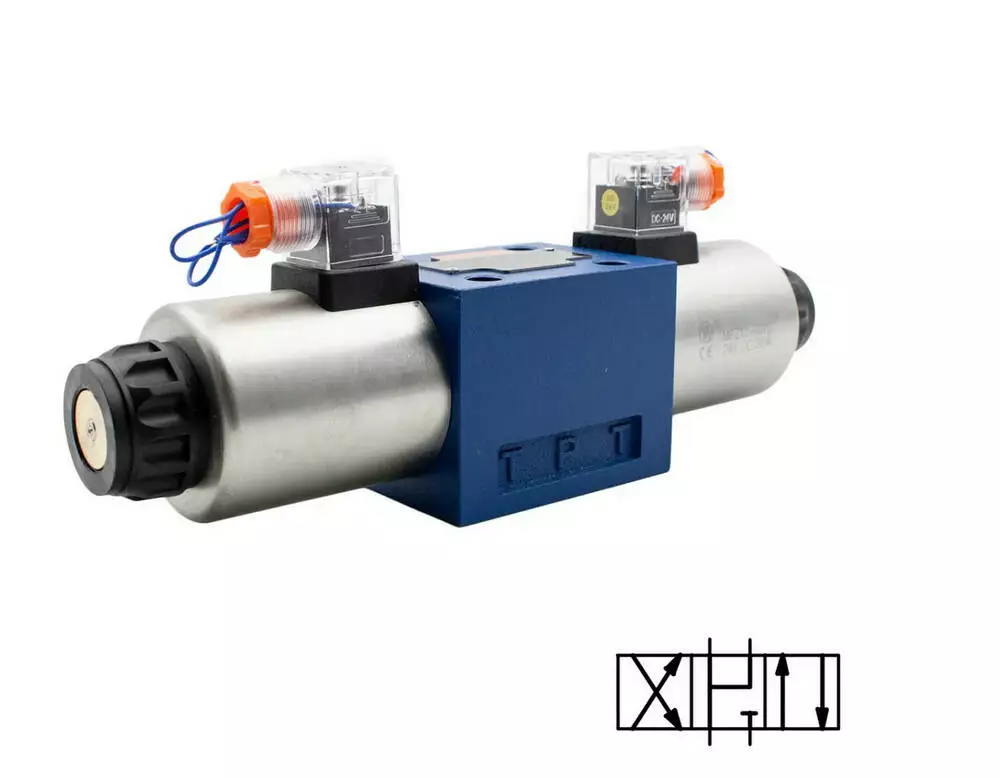 Гидравлические распределители 44WE6M-6XCG24N9Z5L (ДУ6, схема М, 24 схема) являются 3х позиционными с двухсторонним управлением, с условным проходом 6 мм, нормально-закрытыми с пружинным возвратом золотника.