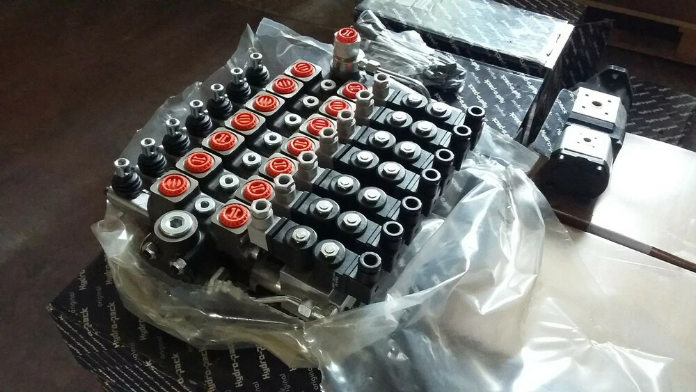 Гидрораспределитель 9 секционный с электромагнитным управлением на 12 или 24 Вольта с нониманальной подачей масла от 100 л/мин импортного производства ведущих турецких заводов гидравлики Hidros, GMS Hydraulics.