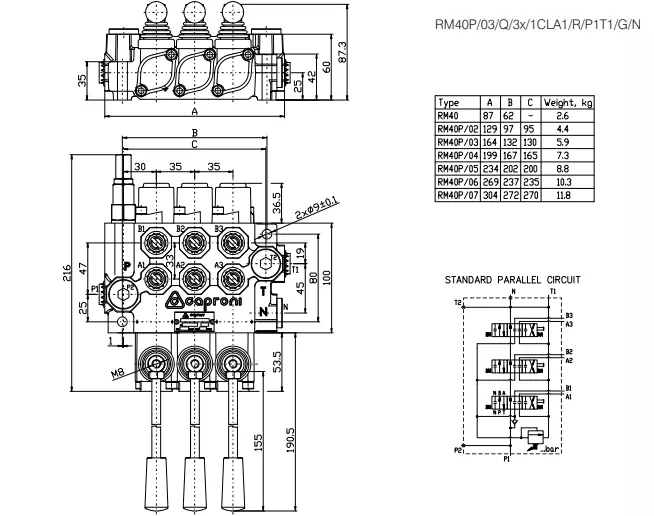 Моноблочный гидравлический распределитель RM40P предназначен для параллельного распределения жидкости и прямого прохождения потока от насоса к резервуару в нейтральном положении возможны опции «Закрытый центр» и «Перенос» при установке дополнительных адаптеров.