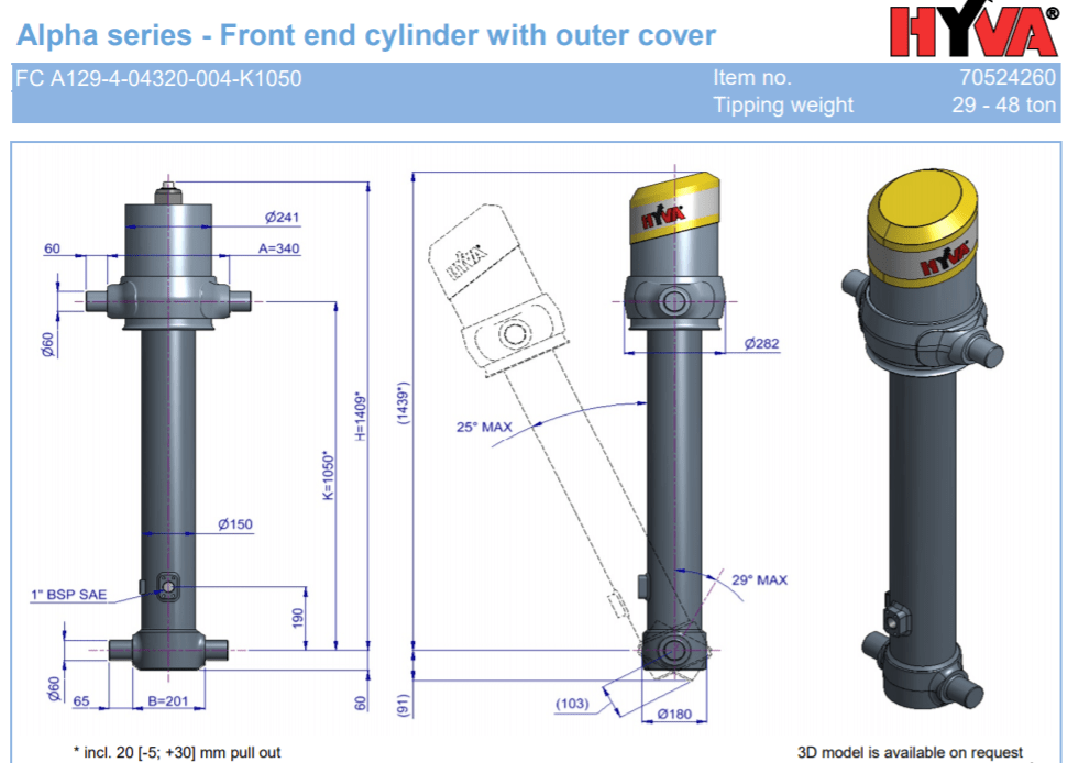Гидроцилиндр FC A129-4-04320-004-K1050 (фронтальный с кожухом) Hyva 70524260