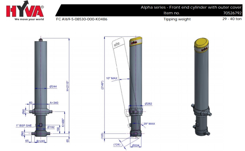 Фронтальный телескопический гидроцилиндр компании HYVA типа FC предназначен для самосвалов и полуприцепов-самосвалов с задней разгрузкой.