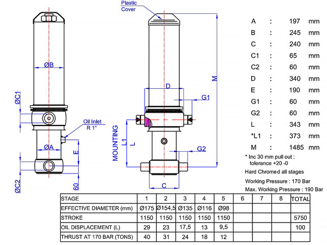 Гидроцилиндр Hidromas GHS 175-5-5750-L343 H выдерживает максимальное давление до 190 бар и обладает грузоподъемностью 40 тонн, что гарантирует его надежность и эффективность в самых требовательных условиях. Диаметр уха GE 50 (Ø50) обеспечивает надежное крепление, а объем 29 литров позволяет поддерживать стабильную работу системы. Hidromas GHS 175-5-5750-L343 H - идеальный выбор для тех, кто ищет долговечное и мощное гидравлическое решение.