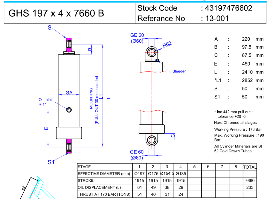 Гидроцилиндр Hidromas GHS 197-4-7660-L2410 B (фронтальный ухо-ухо)