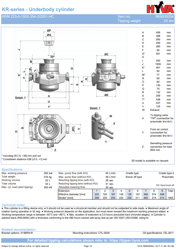 Гидроцилиндр KRM 223-9-1955-354-G0261-HC (подкузовной) HYVA