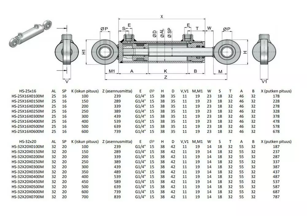 Например, HS-100x50x0200 с диаметром поршня 100 цилиндров (100 мм), диаметром 50 мм (50 мм) и 0200 - длина хода цилиндра (200 мм)