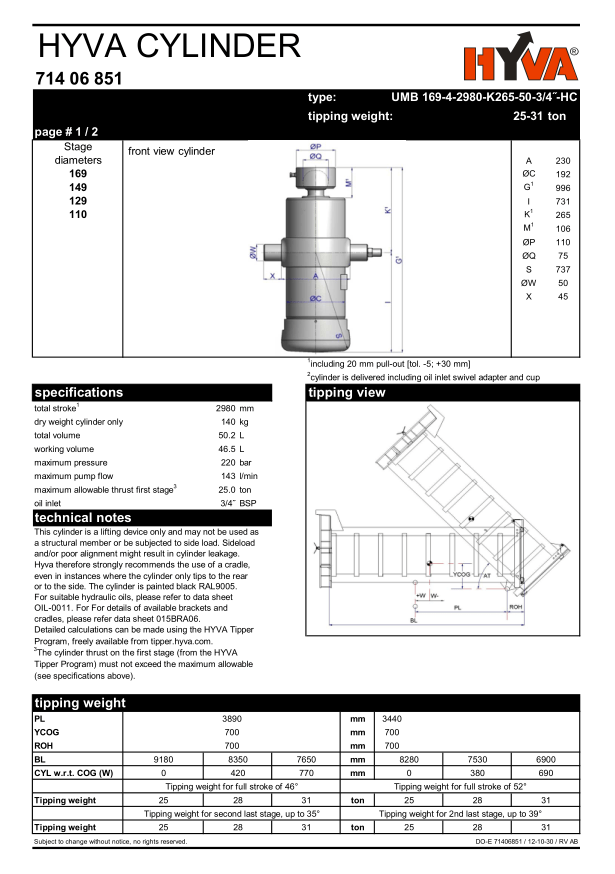 Применение подкузовных цилиндров HYVA гарантирует высокую грузоподъёмность и несколько способов разгрузки. Использование цилиндра с шаровой опорой для 3-х сторонней разгрузки позволяет производить её на сторону и назад. HYVA рекомендует всегда использовать шарнирную опору цилиндра и клапан ограничения подъёма. Для цилиндров UMB 149 и 169 HYVA предлагает заказывать шарнирную опору цилиндра со встроенным клапаном ограничения подъёма и с двумя кронштейнами.
