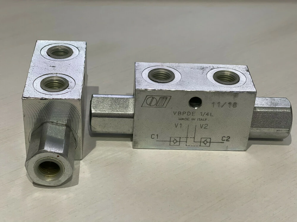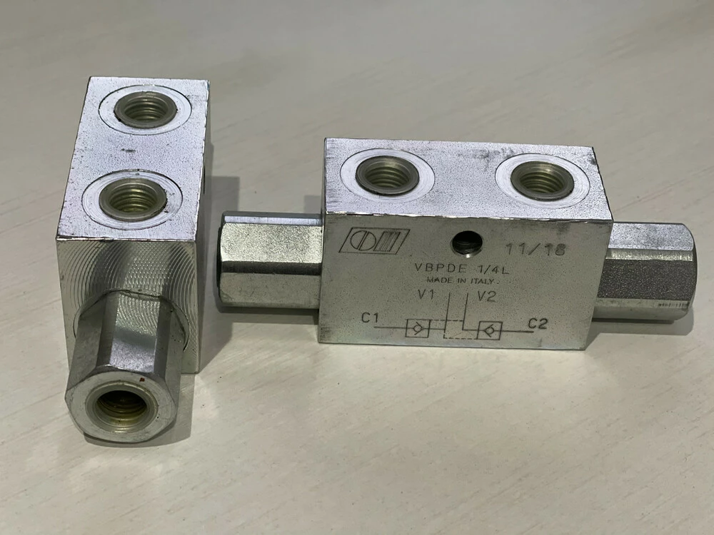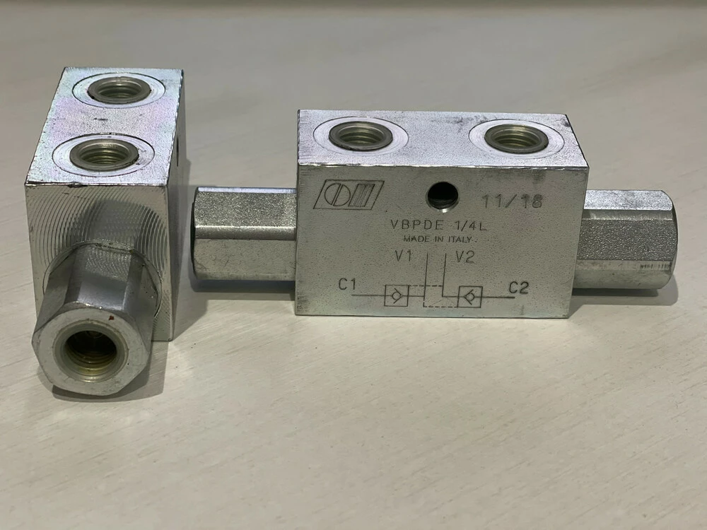 Гидрозамок импортный производство Италия тип VBPDE 1/4" L, данный гидрозамок позволяет свободно пропускать до 20 л/мин потока рабочей жидкости в одном направлении и запирает поток в противоположном направлении до тех пор, пока давление управления (пилотное управление) не откроет запорный элемент.