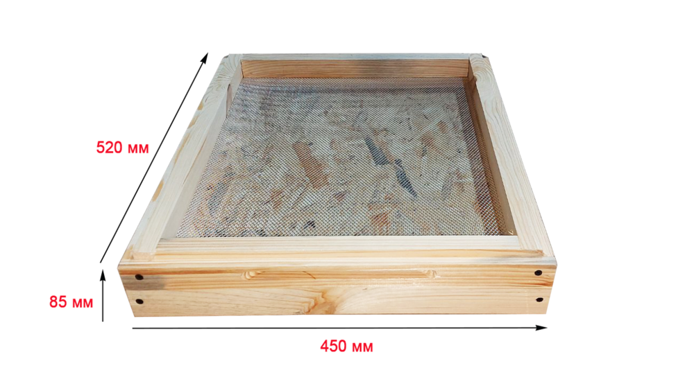 Изделие изготовлено из высококачественного массива сосны с остаточной влажностью 8-12%. Высокое качество древесины гарантирует сохранность эксплуатационных характеристик на длительное время без разбуханий и деформаций. Днище представляет собой многоуровневую конструкцию с повышенным функционалом. Верхний ярус днища состоит из мелкоячеистой алюминиевой сетки с отверстиями 2*8. Нижний ярус представляет собой выдвижной деревянный лоток. Продуманная конструкция днища позволяет осуществлять гигиеническую чистку улья и производить контроль по обработке пчелиной семьи от клеща Варроа. По сравнению с глухим дном многоуровневая конструкция способствует вентиляции в улье. Она необходима для предотвращения так называемой “пчелиной бороды”, что существенно увеличит объемы медосбора с семьи. При установке донного пыльцеуловителя многоярусное дно можно использовать как пыльцесборник. Пыльца сквозь сетку будет высыпаться в лоток. Древесное гигиеническое дно на 10 рамок совместимо с ульями ППС.