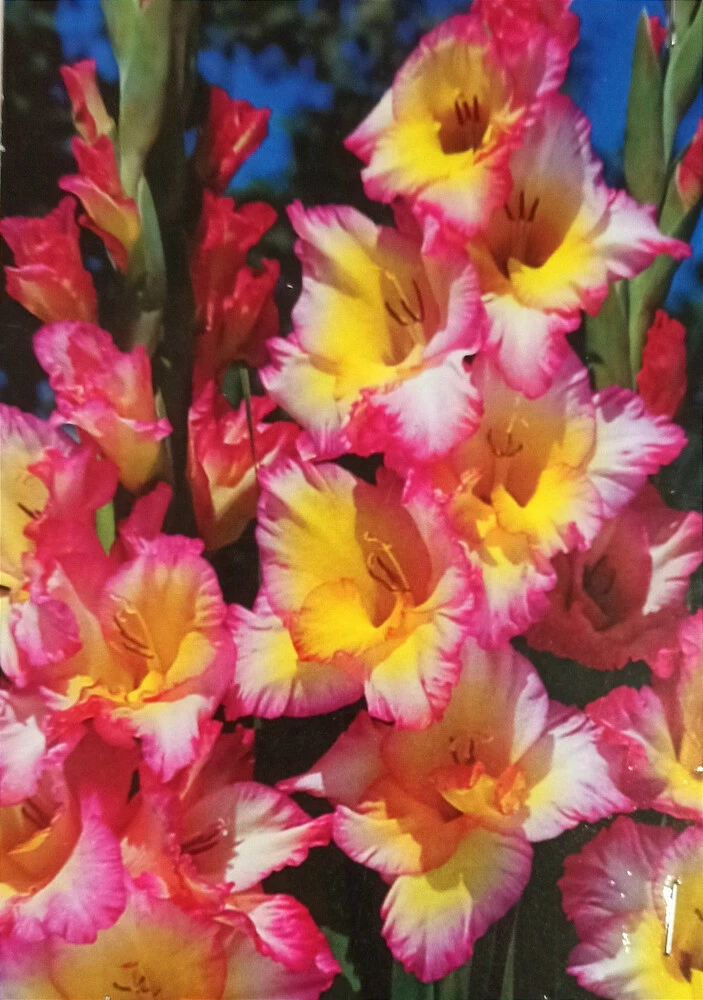 Луковицы гладиолуса крупноцветкового , имеет гофрированные края, сочетания белой сердцевины и розовой каймы, высота растения 90-150 сантиметров, цветение июль-сентябрь.