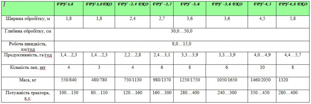Глибокорозрихлювачі  універсальні обробляють ущільнений грунт різних типів на глибину від 30 до 50 см з метою його розущільнення. Операція відбувається без перевертання пласта і забезпечує подрібнення з перемішуванням верхнього шару грунту для поліпшення водно-повітряного стану корневмісного шару, який запобігає розвитку ерозії грунту, сприяє накопиченню вологи і підвищує врожайність сільськогосподарських культур. Оброблений універсальним глибокорозрихлювачем грунт нагромаджує додатково понад 300 тон вологи на гектар. При цьому запобігає створенню водяних блюдець на полі і вимоканню сільськогосподарських культур.  Робочі органи розташовані на рамі симетрично!!! Це виключає дію на навіску трактора моменту сил, які виникають між робочими поверхнями глубокорозрихляющих лап першого і другого ряду з куснями грунту, що забезпечує якісніший обробіток грунту і виключає викручування агрегату відносно ходу при роботі.  Використані робочі органи типу "ПАРАПЛАУ" виробництва "BELLOTA" (Іспанія), виготовляються з борної сталі з термообробкою і мають високу зносостійкість та пружність, забезпечують вертикальне і горизонтальне хвилеподібне переміщення грунту з економією енерговитрат. Агрегат комплектується (за бажанням замовника)  - або опорним катком, який виконує лише функцію регулювання глибини обробітку, або тандемно-шпорчатим катком, який забезпечує подрібнення рослинних залишків та додаткове спушення верхнього шару грунту на глибину до 12см.
