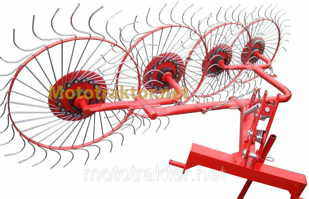 Вращение дисков происходит очень легко, за счет установленных качественных подшипников. Пруты для граблей-ворошилок должны быть прочными и одновременно пружинистыми, поэтому изготавливаются из высоко углеродистой стали.