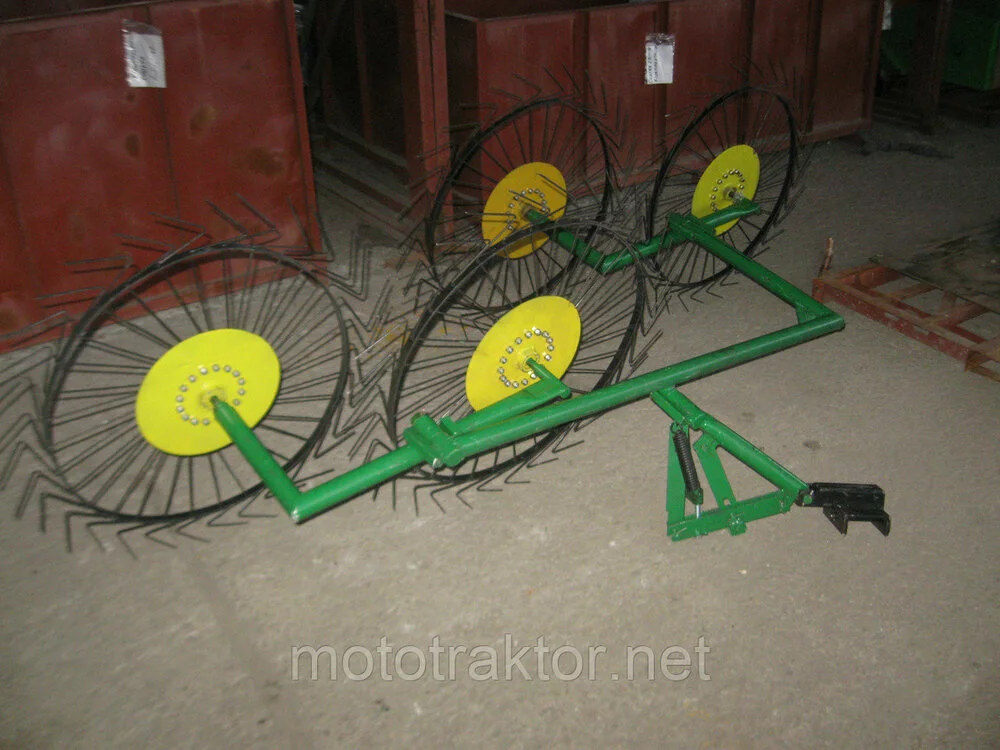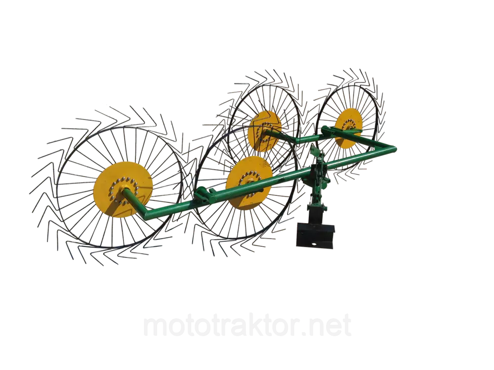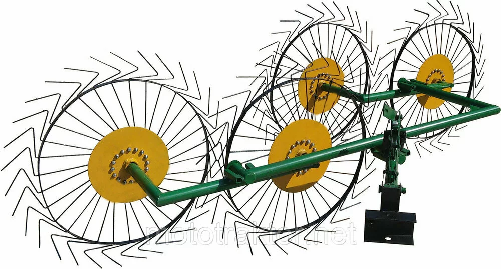 Диски установлены на шарнирно подвижных рамах — это позволяет дискам повторять почву и эффективно сгребать сено.