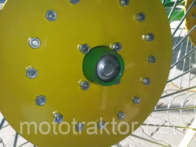 Каркас граблей имеет высокую прочность за счет использования толстостенной трубы. Независимые и взаимозаменяемые сгребающие колеса смонтированы на конических роликоподшипниках, что дает высокую надежность конструкции.