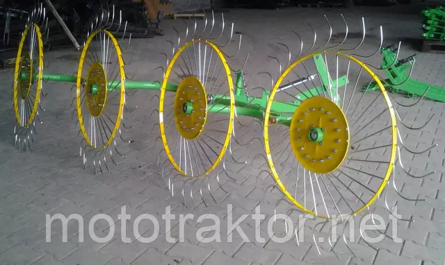 Каркас граблей имеет высокую прочность за счет использования толстостенной трубы. Независимые и взаимозаменяемые сгребающие колеса смонтированы на конических роликоподшипниках, что дает высокую надежность конструкции.
