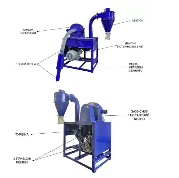 Обладнаний 3 кВт -им мотором та системою пневмодачі зерна він легко переробляю до 260 кг/год.