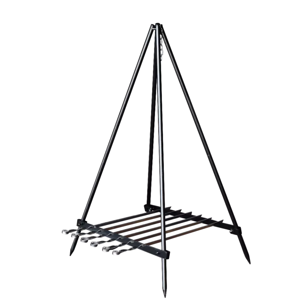 Четыренога универсальная с крючком для подвешивания казана и раскладки шампуров – выполнена из стали 45. Это простой и  незаменимый инвентарь для  кемпинге или рыбалки.