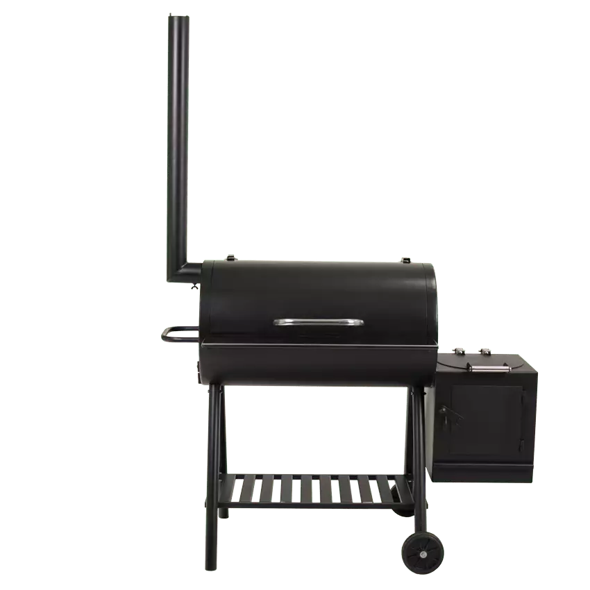 Гриль-барбекю-смокер оснащен двумя полками: передняя полка с пищевой нержавейки для установки посуды с продуктами и нижняя полка с чёрного металла для углей или инвентаря.