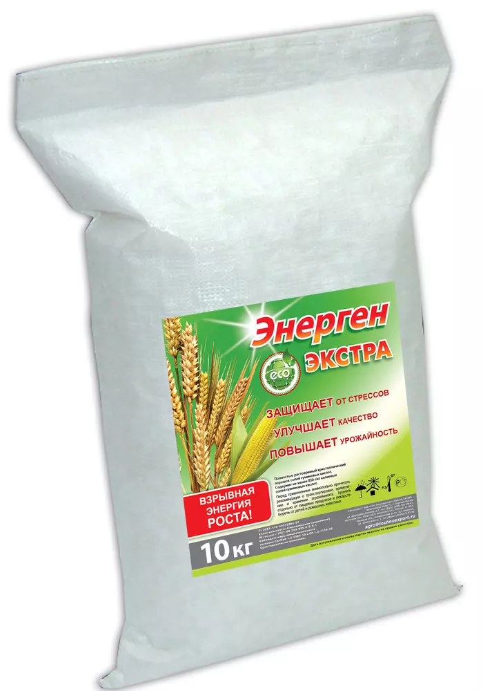 ЭНЕРГЕН ЭКСТРА, РП не менее 85% Сухое концентрированное растворимое органо-минеральное удобрение на основе гуминовых кислот. Основное действующее вещество: гумат калия Состав: препарат содержит не менее 850 г/кг калиевых солей гуминовых, фульвовых и кремниевых кислот, серу, макро- и микроэлементы (Co, Ca, Mg, Fe, Mn, Cu, Zn) Спецификация: агрегатное состояние – порошок черного цвета размер частиц – 40 – 100 мкм плотность – 0,68 г/см3 растворимость – полная смешиваемость с водой - полная гуматы калия – не менее 82-85 % значение рН концентрированного раствора 9, не более минеральная часть (зола) 10-12 % Применение: - для предпосевной обработки (замачивания и опрыскивания) семян (в том числе для выращивания семенного материала), клубней, черенков, саженцев и рассады; - для фолиарной обработки (опрыскивания) растений; - для полива (опрыскивания) почвы, газонов и пастбищ, полива под корень рассады, цветов, кустарников, деревьев, других однолетних и многолетних растений; - в системах капельного полива теплиц. - может использоваться как высококачественный компонент комплексных водорастворимых препаратов и сухих порошкообразных смесей, а также для введения в состав гумизированных органо-минеральных удобрений; - может применяться при компостировании для разрушения древесных остатков (целлюлозы, гемицеллюлозы, протеинов, лигнина), ускоряя тем самым накопление гумуса. Совместимость: допускается применять в баковой смеси с пестицидами, регуляторами роста и с комплексными жидкими удобрениями и микроэлементами по согласованию с производителями.
