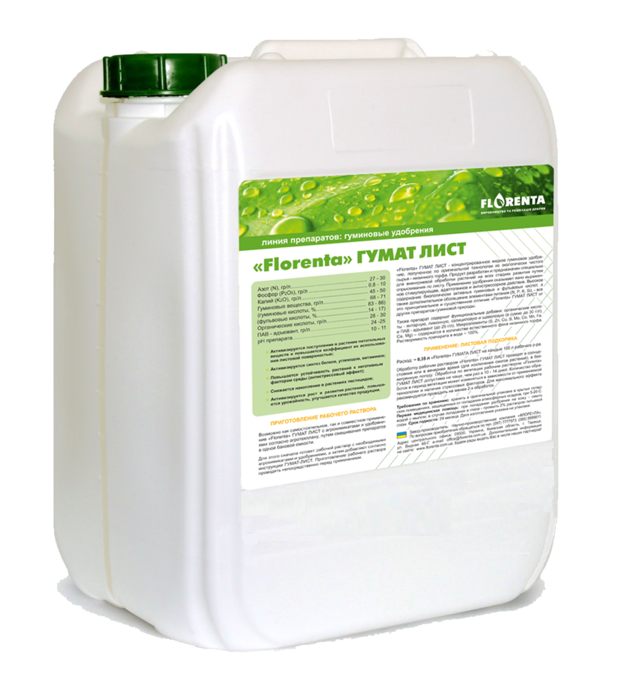 Расход: ~ 0,35 л «Florenta» ГУМАТА ЛИСТ на каждые 100 л рабочего раствора.