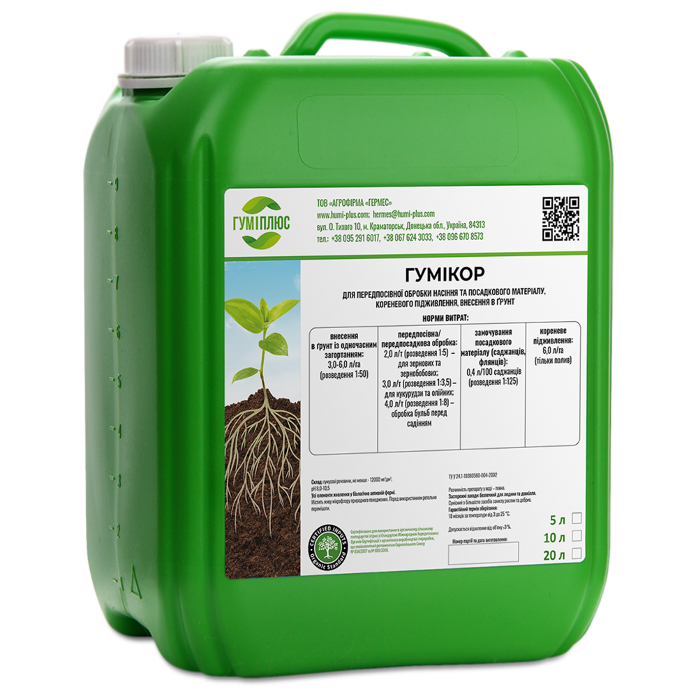 Гумікор – це високонцентрована гумінова суспензія, яку отримано на основі вермікомпосту, продукту переробки гною ВРХ каліфорнійськими черв’яками Еisеnia fetida. Застосовується для передпосівної обробки насіння та внесення в ґрунт.