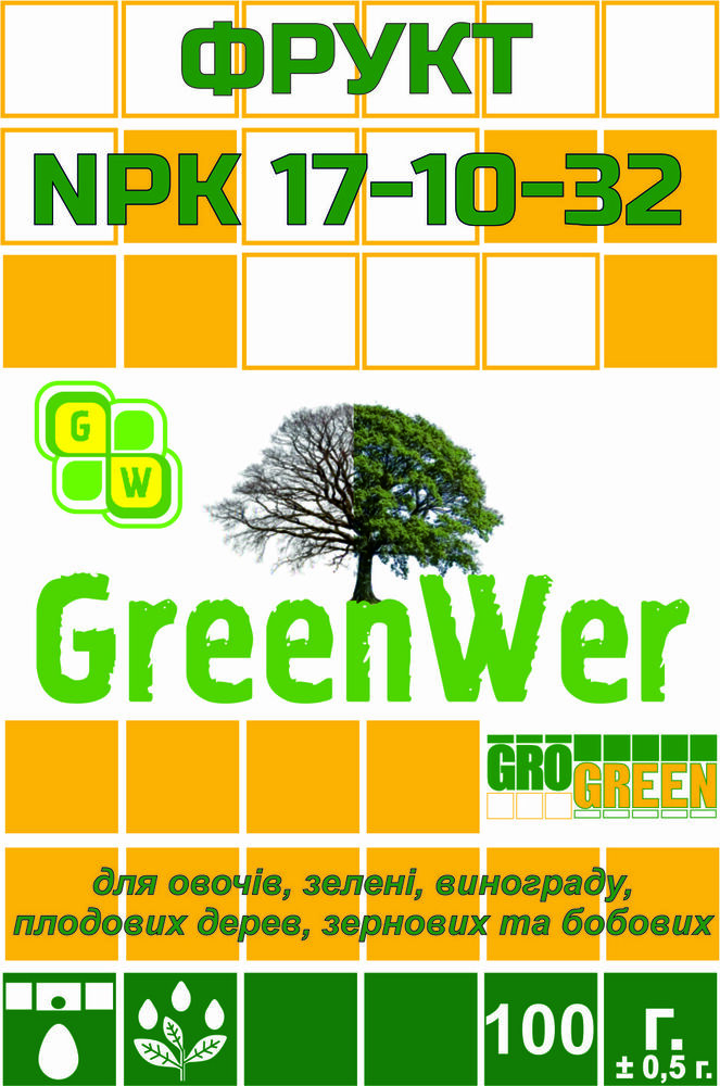GROGREEN NPK 17-10-32 + ТЕ (фрукт) TE - это комплексное водорастворимое NPK удобрения для фертигации и листовых обработок.  Вся гамма удобрений покрывает необходимость в элементах питания большинства культур на всех стадиях выращивания. Благодаря первоклассным компонентам и сбалансированному составу, удобрения GROGREEN являются основой для успешной программы фертигации.