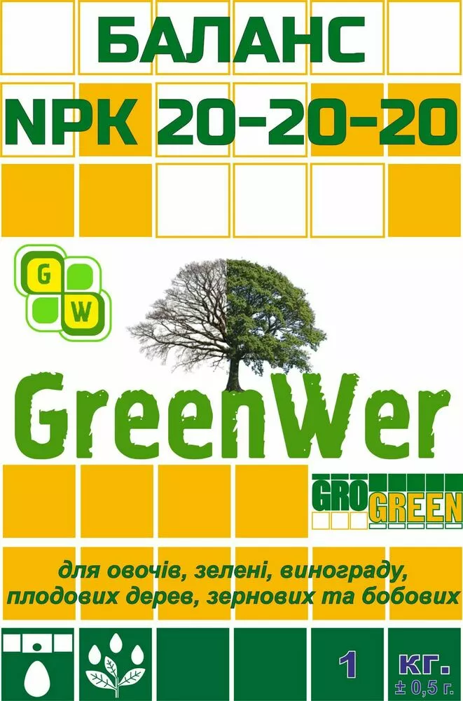 GROGREEN NPK 20-20-20+ TE - это комплексное водорастворимое NPK удобрения для фертигации и листовых обработок.  Вся гамма удобрений покрывает необходимость в элементах питания большинства культур на всех стадиях выращивания. Благодаря первоклассным компонентам и сбалансированному составу, удобрения GROGREEN являются основой для успешной программы фертигации.