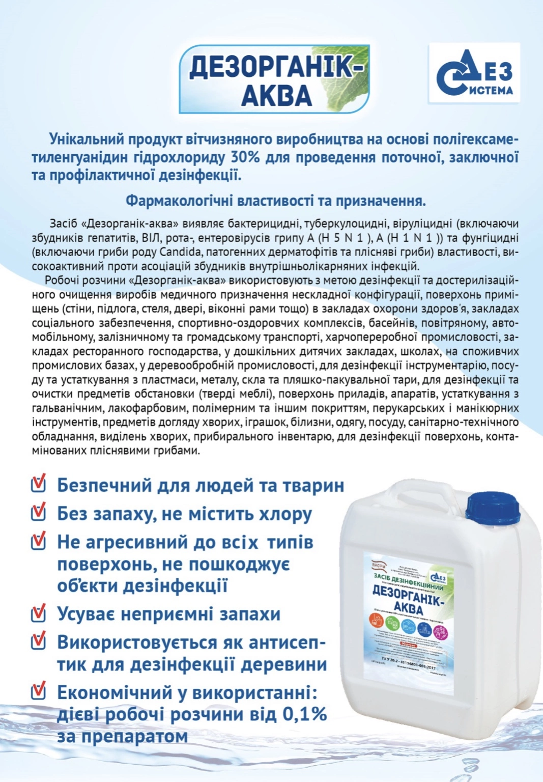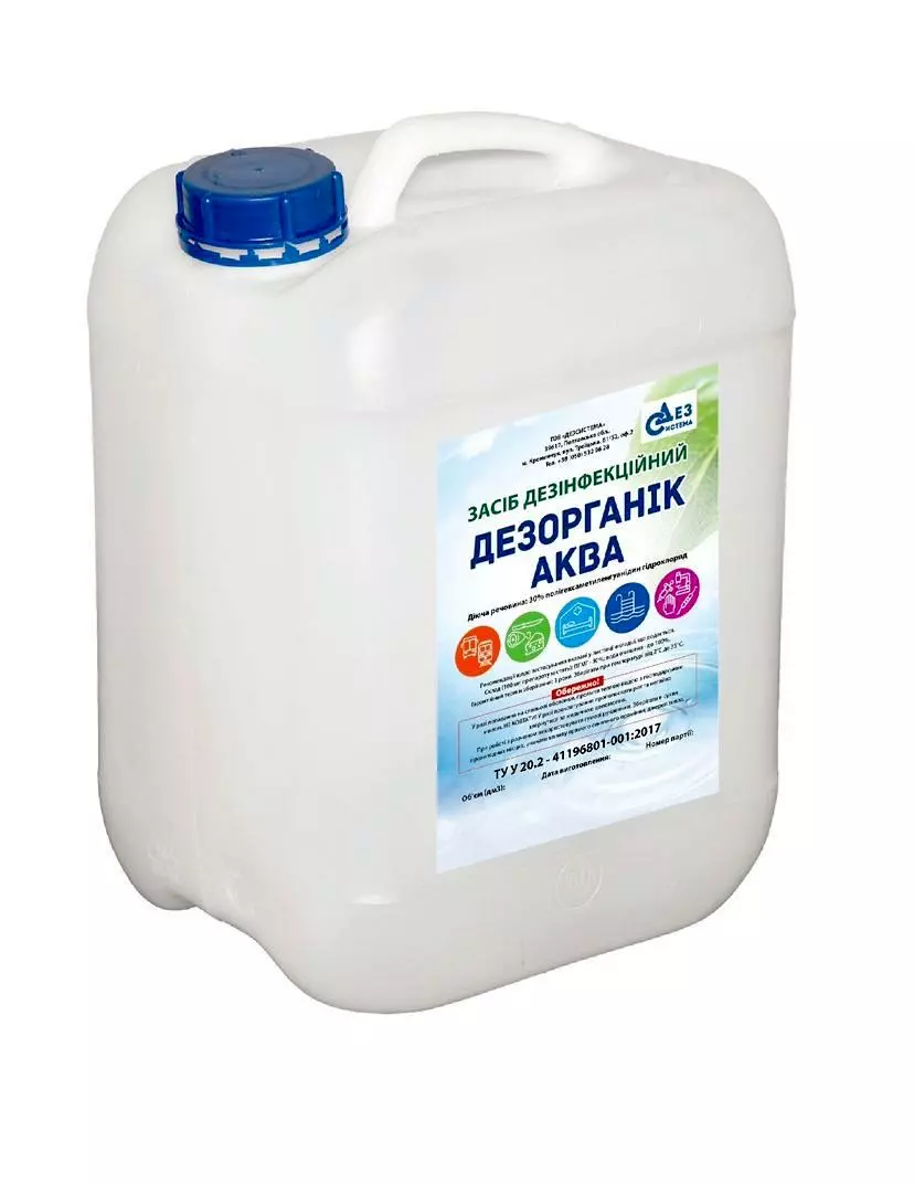 СВОЙСТВА ДЕЗОРГАНИК-АКВА: бактеридидное, туберкулоцидное, вирулицидное и фугницидное действия. Действующее вещество: полигексаметиленгуанидин гидрохлорид. Не вредно для человека, органик. Ненужно смывать. Без хлора, без запаха.