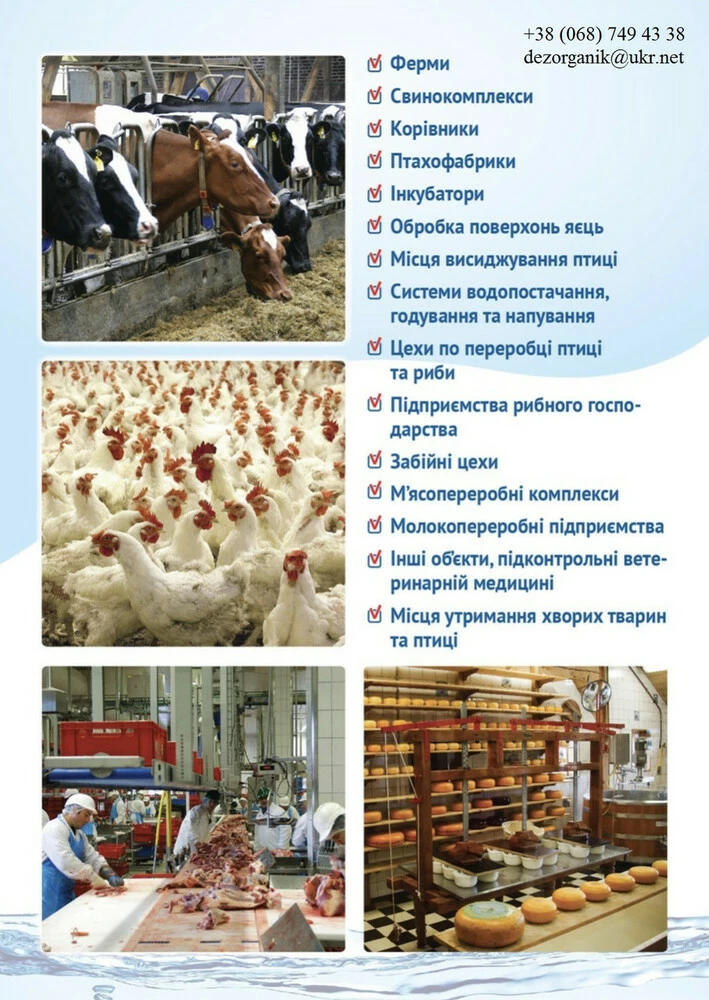 - Птицефабрики, свинокомплексы, коровники, фермы, инкубаторы, обработка поверхностей яиц, ветпункты;