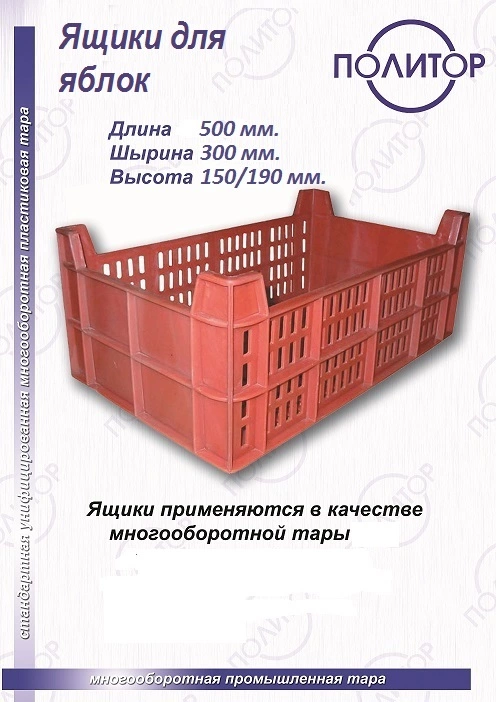 У нас вы можете купить, ящики для яблок оптом и в розницу, новые и бывшие в употреблении. Ящики для яблок изготовлены заводом тары-упаковки Политор, отличаются высокой прочностью, длительным сроком эксплуатации. Ящик для яблок пластиковый, предназначены в качестве многооборотной промышленной тары, сроком эксплуатации не менее 3-х лет. Ящики для плодово-ягодной продукции практичны при эксплуатации и сборе урожая, транспортировке и хранении различных фруктов, ягод (яблок, груш, сливы, персика, вишни, черешни, черники, малины, винограда).У нас вы можете заменить старые пластиковые ящики для яблок на новые.
