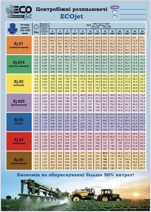 Возможность работать нормой вылева от 40 до 200 л. / Га. при рабочем давлении от 2х до 4х атм. и скорости движения 8-10 км.ч. за счет мелкой капли и покрытия более 80% общей площади растения. Для работы на более высоких скоростях смотрите нормы вылева в таблице.