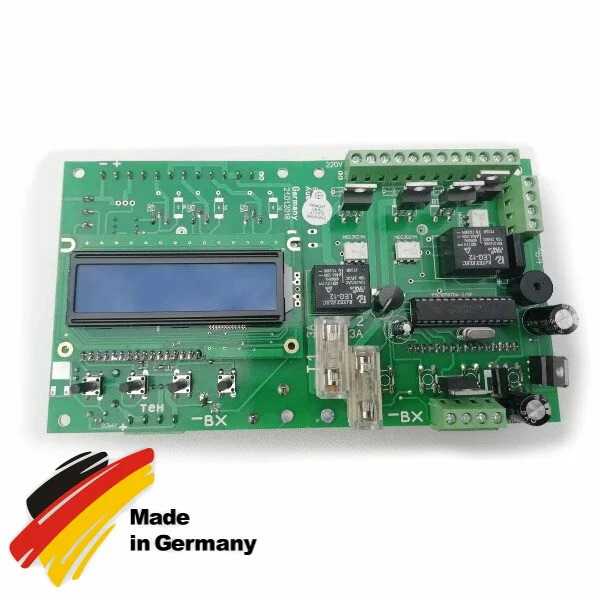 Плата управления. Данная плата изготовлена на высоком уровне соблюдая весь технологический процесс. Блок управления производства Германия. Все комплектующие производства Европы Блок управления имеет многоинформативную информацию. Кроме стандартных температура,влажность,переворот,сеть,время,уровень и тд. На нем отображается время самой инкубации. Дисплей имеет подсветку что дает возможность при любом освещении просматривать информацию.