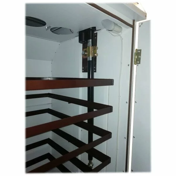 Внутри корпуса встроены вентиляторы, которые циркулируют , а так же выталкивают остаточный теплый воздух при этом идет подача холодного воздуха. Система циркулирует по периметру внутренней камеры инкубатора что обеспечивает равномерное охлаждение яиц на всех лотках.