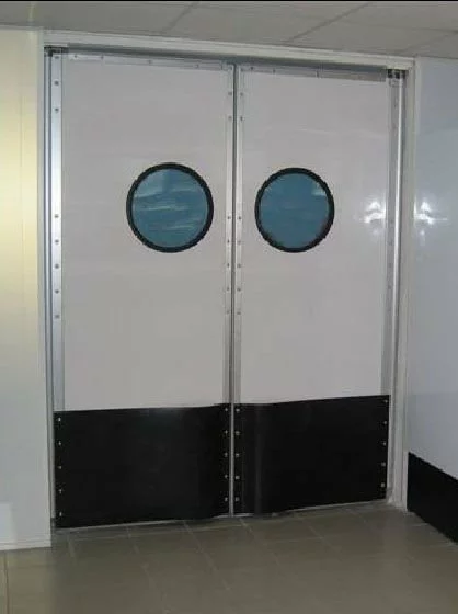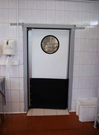 Жесткие распашные двери для поддержки стабильного температуро-влажностного режима в любых помещениях. Изготовлены из немецких сэндвич-панелей (слой прессованного полистиролового пенопласта между двумя слоями ударопрочного поливинилхлорида) на алюминиевом каркасе. От ударов штабелерами или тележками полотно защищают отбойные листы из полиэтилена.