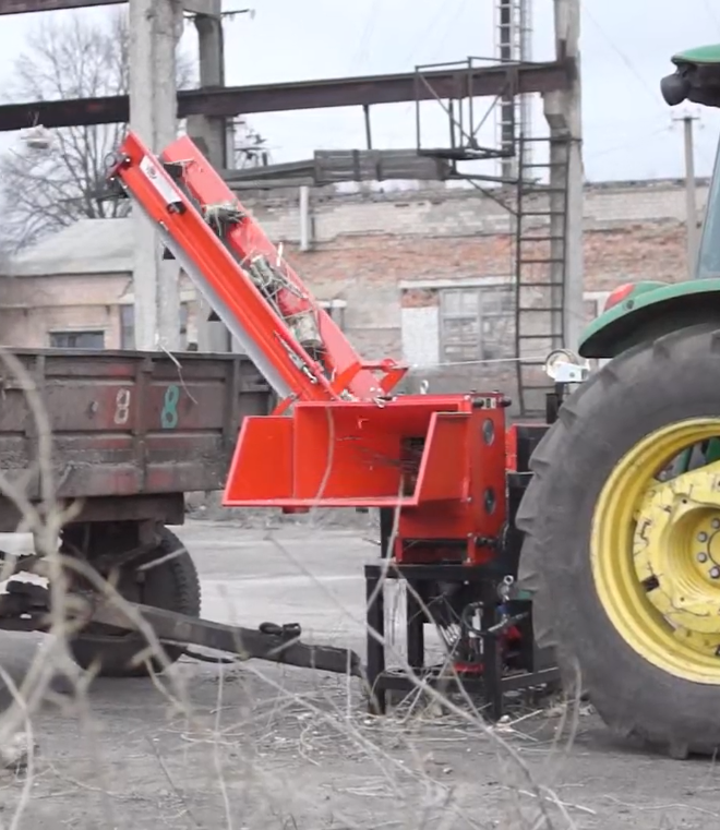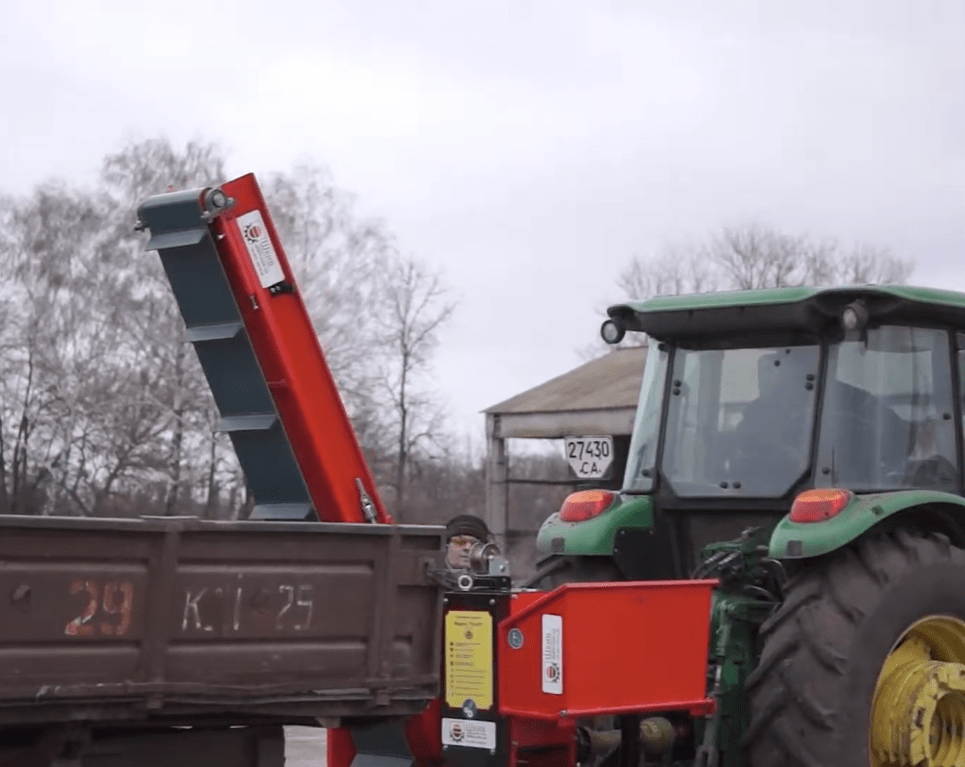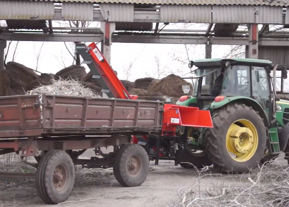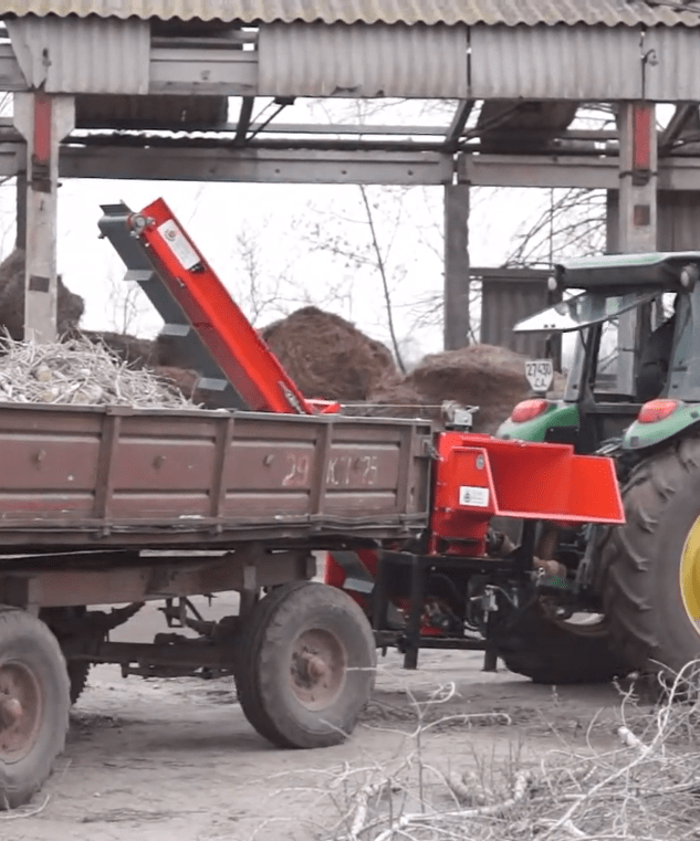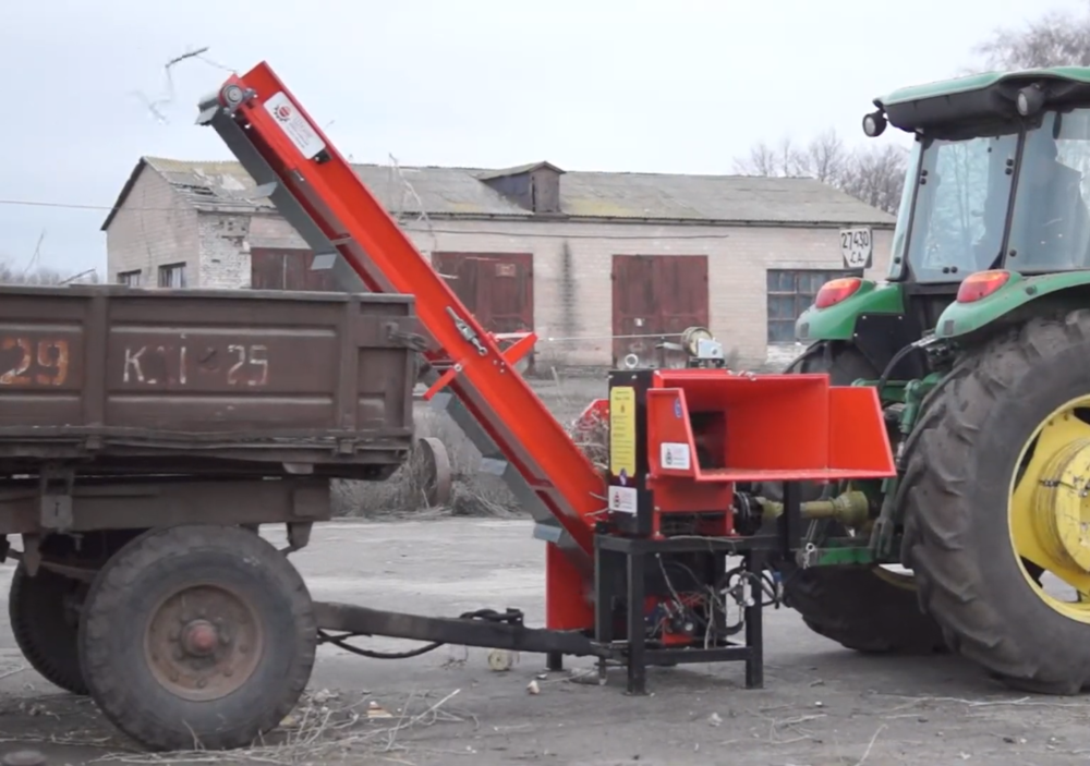 Данная модель комплектуется конвейерной лентой, которая автоматизирует загрузку дров в прицеп высотой до 3м, что значительно облегчает работу и повышает производительность до 12 м3/ч готовой продукции. Благодаря внедрению привода конвейера от гидромотора стала возможна модификация конвейерной ленты по направлению хода трактора, что позволяет производить переработку веток более компактно – в одной полосе движения, что является необходимым условием в густонаселенных пунктах и на дорогах общего пользования.