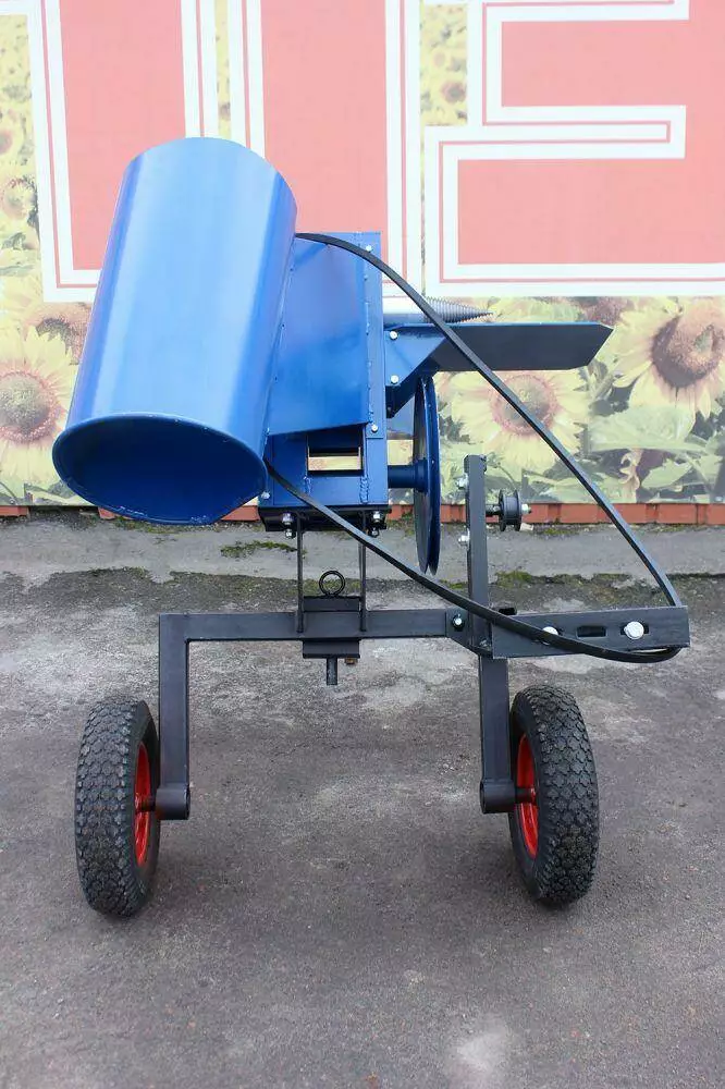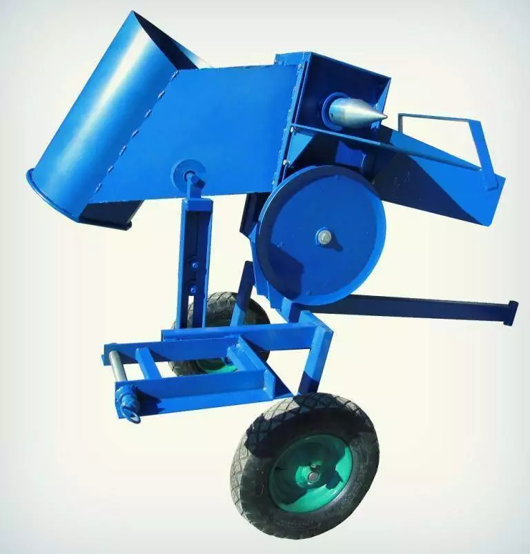 Сердцевина измельчителя закреплена на раму с пневматическими колесами. Транспортировка измельчителя веток для мотоблока осуществляется за прицепной узел, установленный на съемное дышло.