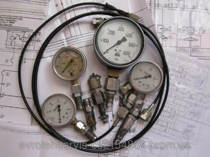 Измерительные гидравлические системы, гидроаккумуляторы , реле давления, Штуцера, датчики давления, расходомеры, резьбовые соединения с манометром.