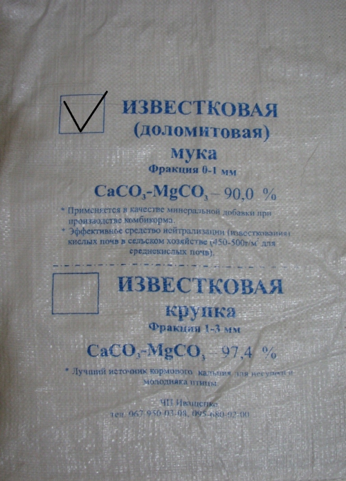 ЧП Иващенко реализует высококачественную Известковую (доломитовую) муку фасованную по 5кг, 30кг. Фракция 0-1мм. массовая доля Са = 37,40%, суммарная массовая доля СaСОз-MgCOз - 97,2% Оптовым покупателям - - существенные скидки Продукция находится на складе в г. Днепродзержинск. Известняк (мука известняковая) (ГОСТ 26826-86) в виде различных соединений состоят из кальция, магния, железа, цинка, йода, медь и других элементов. Для взрослой птицы этот продукт служит для формирования скорлупы яйца, у молодой птицы, с помощью этих веществ формируется костяк. Известняк и мраморную крошку применяют в качестве минеральной добавки для производства комбикорма, также в сельском хозяйстве применяется для подкормки животных и птиц, Ее активно используют в качестве удобрения в сельском хозяйстве, на частных фермерских и личных подворьях, а также при выращивании комнатных растений. Дело в том, что доломитовая мука богата кальцием и магнием. Эти микроэлементы очень нужны для правильной вегетации растений. Кроме того, этот карбонатный порошок нормализует кислотность почвы. Результаты применения доломитовой муки - улучшаются условия питания растений; - улучшаются физические, физико – химические и биологические свойства почвы; - в почве увеличивается количество усвояемых форм азота, фосфора, калия, молибдена; повышается эффективность использования вносимых органических и минеральных удобрений; - улучшаются условия питания растений; - связывает радионуклиды, т. е. способствует экологической чистоте урожая; - обогащает почву кальцием, который способствует росту растения, улучшает состояние корневой системы; - улучшает процесс фотосинтеза растений; - эффективное средство борьбы с насекомыми (обладая абсолютной нетоксичностью по отношению к любым живым существам, тонко молотый доломит вызывает абразивное разрушение хитиновых покровов у насекомых). Известкование решает две задачи: снижение кислотности почвы и удобрение почвы кальцием, а часто и магнием, например при использовании доломитовой муки.