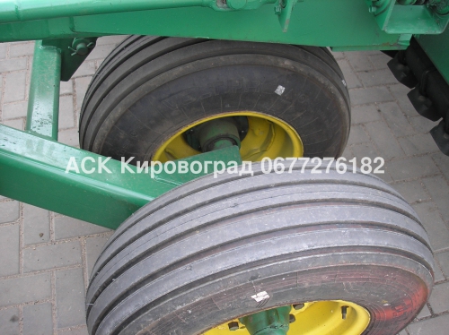 Сеялка John Deere 455 – это прицепная механическая сеялка, которая предназначена для посева зерновых, бобовых и фуражных культур с подсевом трав на хорошо подготовленных и выровненных почвах. Модель 455 выпускается с шириной захвата 7,6 м (двухсекционная) и с шириной 9,1 м и 10,7 м (трехсекционная). В транспортное положение сеялка переводится при помощи гидроцилиндров путем складывания секций вперед и фиксации их вдоль центрального дышла. Транспортная ширина составляет 4,63 м, дорожный просвет 53 см. Сеялка оборудована секциями с двухдисковыми сошниками. При работе диски вращаются, разрезая почву и растительные остатки и, как клин, раздвигают почву, образуя бороздку. Сошниковые секции индивидуально подпружинены и радиально крепятся к раме, что позволяет независимо копировать рельеф и сохранять одинаковую глубину посева. Глубина посева семян регулируется ступенчато с помощью прикатывающего каточка индивидуально для каждой секции от 0 до 9 см с шагом 0,6 см. Проникновение двухдисковых сошников в почву также обеспечивается с помощью гидравлических цилиндров двойного действия, оказывающих воздействие на массивный брус рамы. Сеялка выпускается с шириной междурядья 15 см; 19 см. Сеялка с междурядьем 15 см рекомендуется применять на почвах пониженной влажности и содержащих минимальное количество растительных остатков. Междурядья 19 и 25 см рекомендуется применять на влажных и липких почвах. Модель 455 может оборудоваться цельным бункером для семян или комбинированным бункером для семян и сухих минеральных удобрений. У комбинированного бункера может регулироваться объем отделения под семена – 100%, 60% и 40%. Для высева семян и внесения удобрений в бункере установлены высевающие аппараты катушечного типа. Привод на высевающие катушки передается от опорных колес через цепную передачу и шестеренчатый редуктор. Норма высева семян регулируется за счет изменения рабочей длины катушки. Норма внесения удобрений может устанавливаться в диапазоне от 4,5 до 116 кг/га и регулируется за счет изменения частоты вращения катушки с помощью ступенчатого редуктора. Дополнительно сеялка может оборудоваться бункерами для подсева трав, которые монтируются на передней части основного бункера. Семена трав высеваются в разброс между сошниками и прикатывающими каточками. Норма высева семян регулируется с помощью изменения рабочей длины катушки приблизительно в диапазоне от 1,1 до 78 кг/га (в зависимости от высевающихся культур трав).