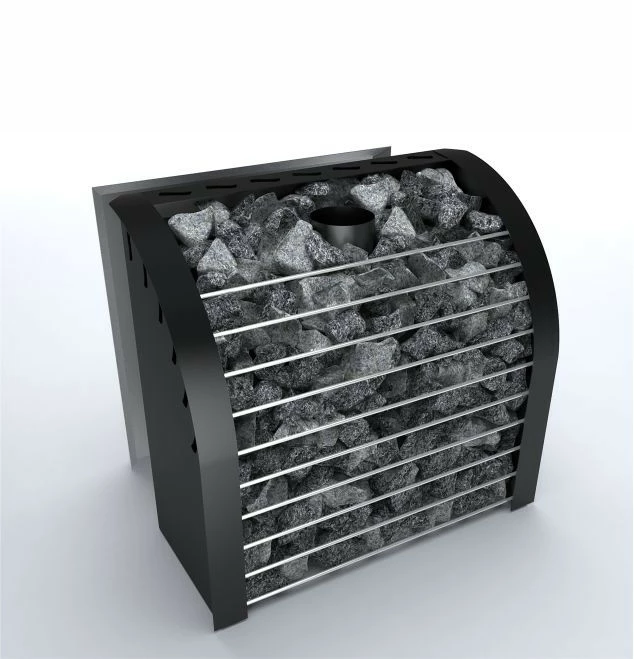 Массивная и грациозная печь-каменка для бани «Каскад» по своему дизайну изогнутой формы каменки для бани, напоминает лавину камней, которые создают элемент неудержимой природной стихии в парной.