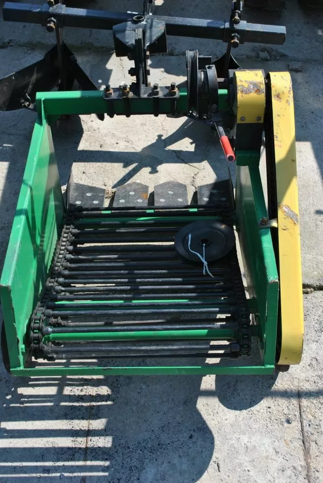 Транспортерная картофелекопалка по своим характеристикам схожа с вибрационным агрегатом. Отличие заключается в наличии транспортерной ленты, а не вибростола. Двигаясь по ленте, картофель хорошо очищается от остатков почвы. Транспортерный агрегат устанавливается на средние и тяжелые мотоблоки.
