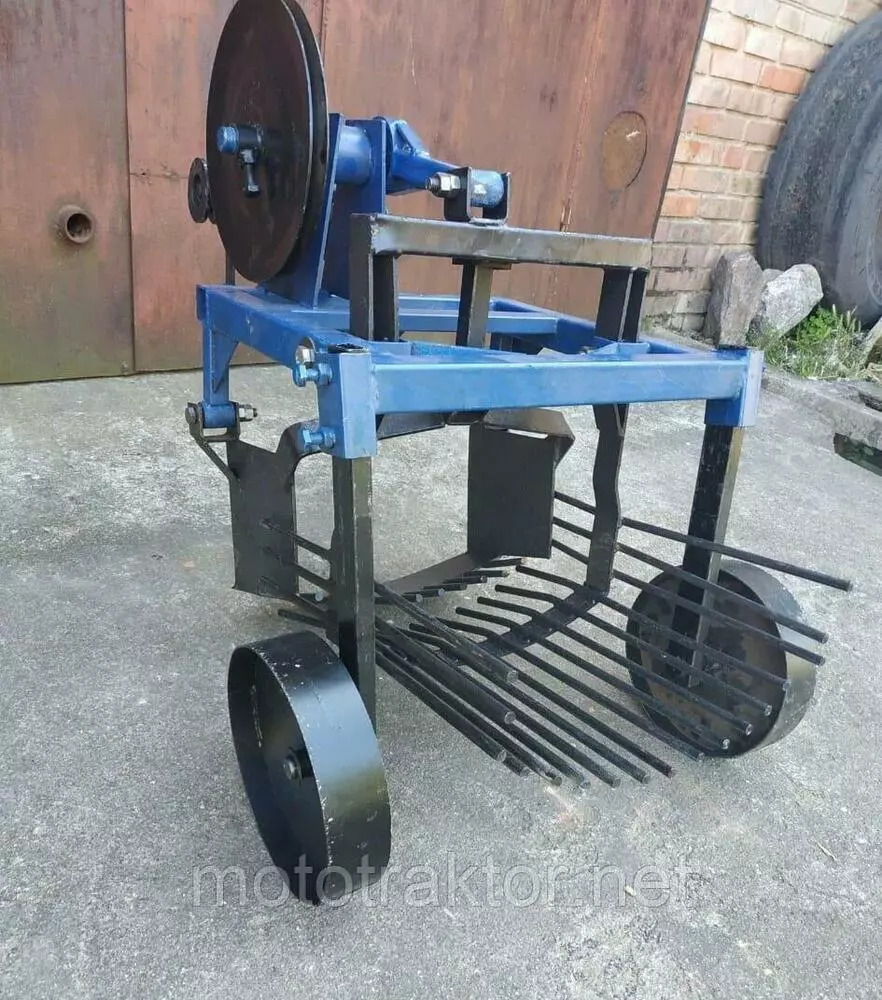 Нож и решето установлены на амортизационных втулках. Когда копатель соединяется с мотоблоком, он дополнительно комплектуется талрепом, поворотным узлом, малым шкивом. Колеса имеют возможность перемещения по высоте для регулировки глубины выкапывания. Прицепной узел также перемещается по высоте.