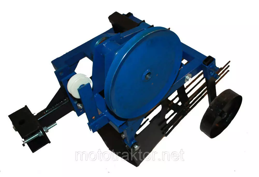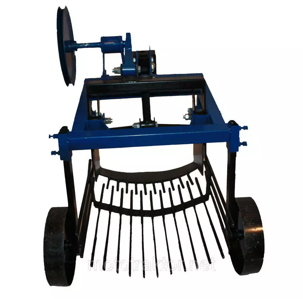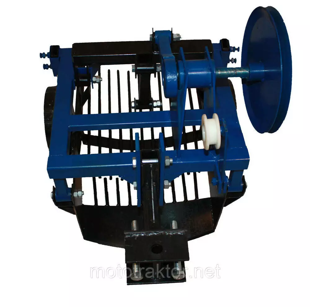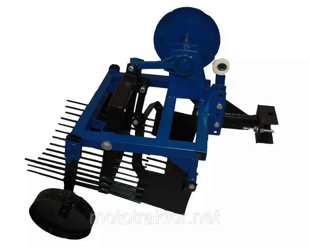Нож и решето установлены на амортизационных втулках. Когда копатель соединяется с мотоблоком, он дополнительно комплектуется талрепом, поворотным узлом, малым шкивом. Колеса имеют возможность перемещения по высоте для регулировки глубины выкапывания. Прицепной узел также перемещается по высоте.